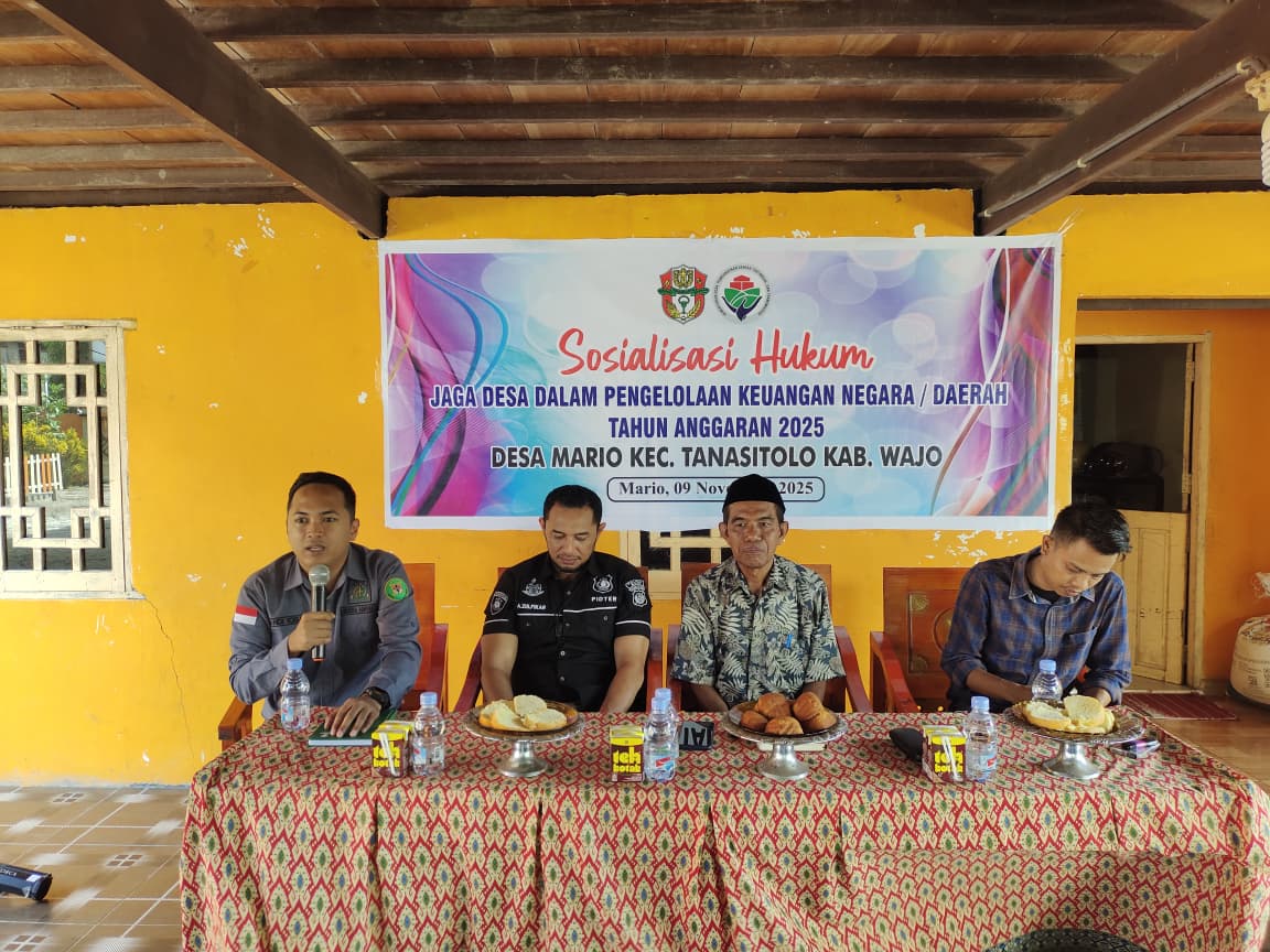 MARIO – pada (09/11/2025) Dalam rangka mewujudkan tata kelola keuangan desa yang transparan, akuntabel, dan sesuai dengan ketentuan hukum, Pemerintah Desa Mario, Kecamatan Tanasitolo, Kabupaten Wajo, melaksanakan kegiatan Sosialisasi Hukum “Jaga Desa” dalam Pengelolaan Keuangan Negara/Daerah Tahun Anggaran 2025. Kegiatan ini berlangsung di Balai Desa Mario dan dihadiri oleh berbagai unsur pemerintahan serta masyarakat desa.