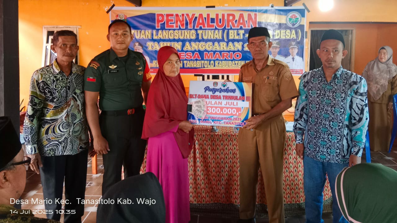 Kepala Desa Mario, H. La Tejjo, S.E., yang menjelaskan bahwa penyaluran BLT merupakan hasil dari verifikasi dan validasi data keluarga penerima manfaat yang telah dilakukan secara transparan dan akuntabel.